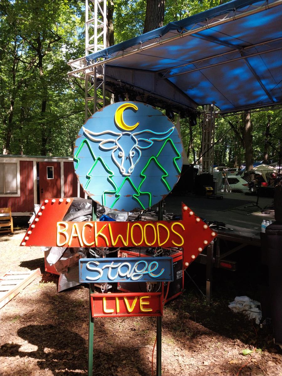 – Speaking of the Backwoods stage, this year marked my first time back at the stage since 2019 (having opted to stay at a hotel since then). It was exciting to get to go back into the campground and see how everything looked. I thought they did a great job on the improvements to the stage and surrounding area, including adding a neon lit sign, a small makeshift building for artists and further enhancing the seating bowl area. I ended up going to the stage every day – first for The High Hawks and then morning sets from Stringdingers and Said In Stone.